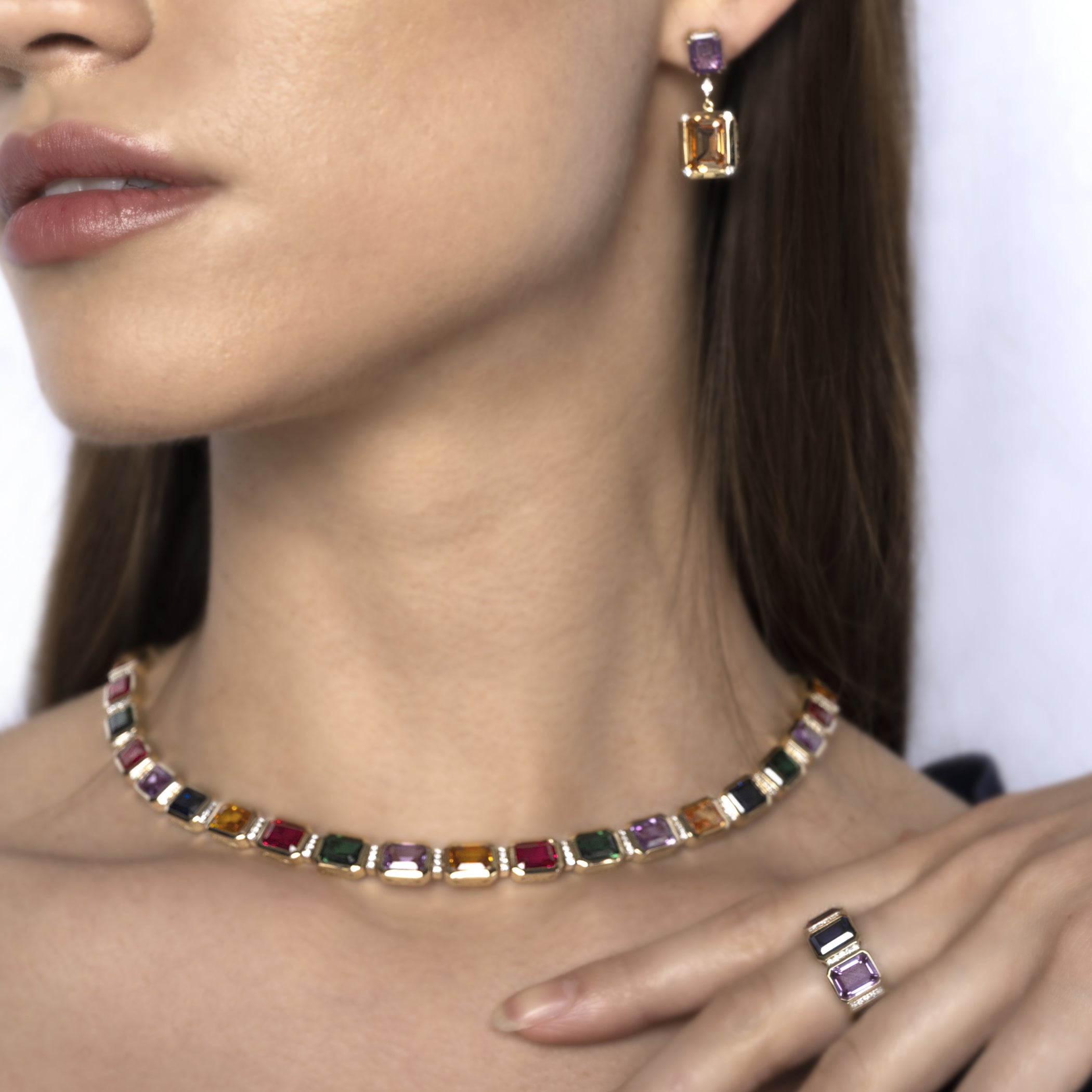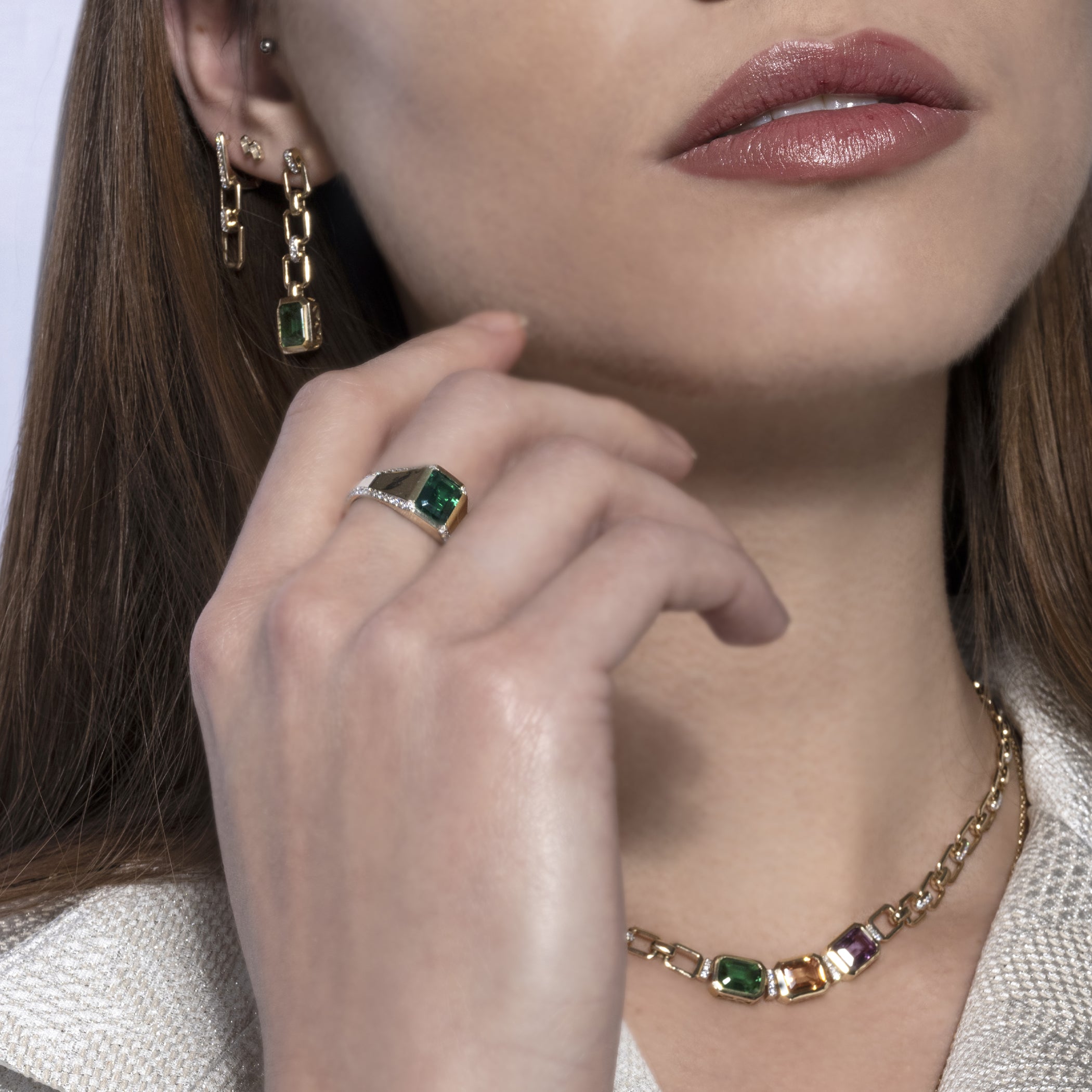 Inspired by nature, Nexus features organic-shaped galleries under every stone, creating a network of elegance in gold and gems rooted in 14K Gold.