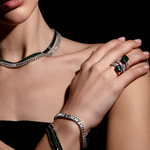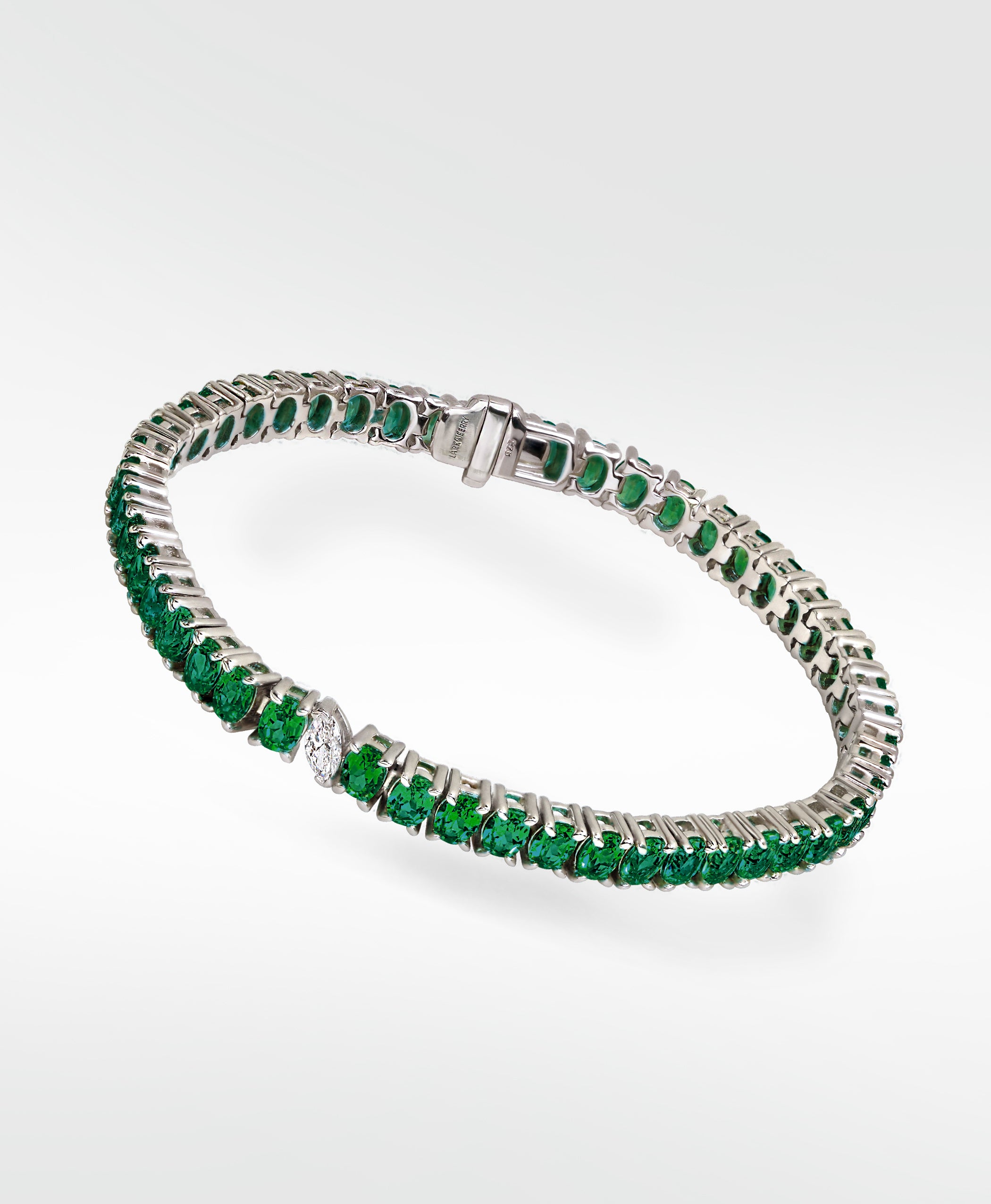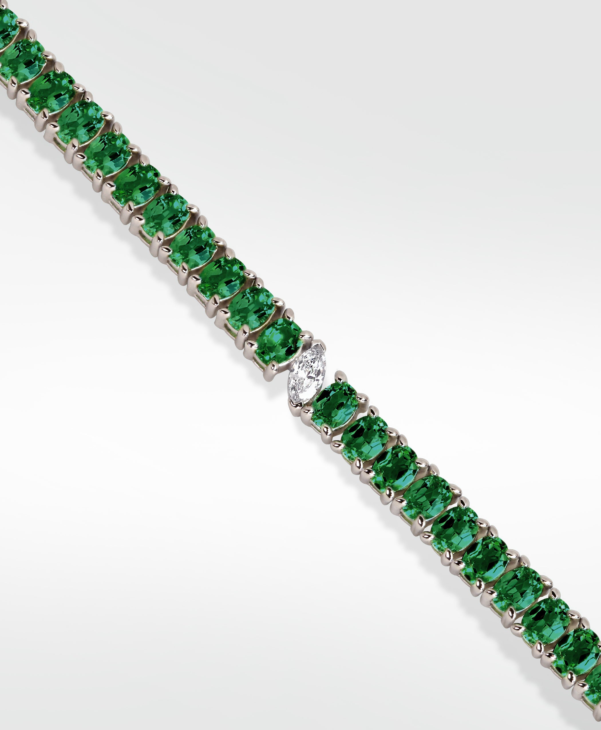 This exquisite tennis bracelet is designed to captivate a portrait set emerald in fancy oval cut. Enhancing its modern allure, a striking offset marquise-cut lab-grown diamond disrupts tradition, transforming it into a truly unique piece.