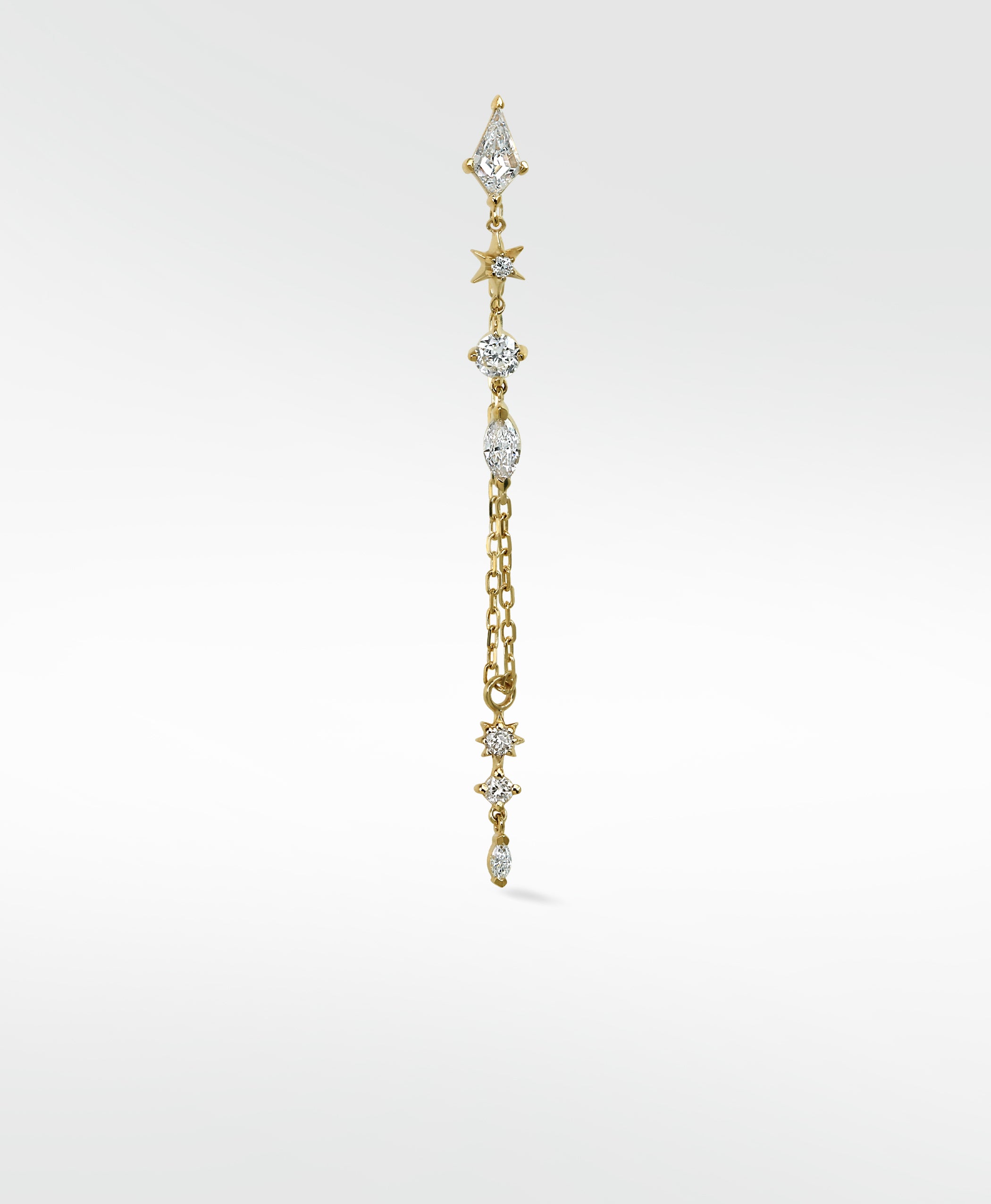 Stars sparkle and sway through the night sky, giving inspiration to our stunning Celestial Mixed Cut Chain Drop Earrings. Featuring perfect lab diamonds in kite, marquise and brilliant cuts, set in 14k gold and with a diamond cut chain to keep you sparkling through the night.