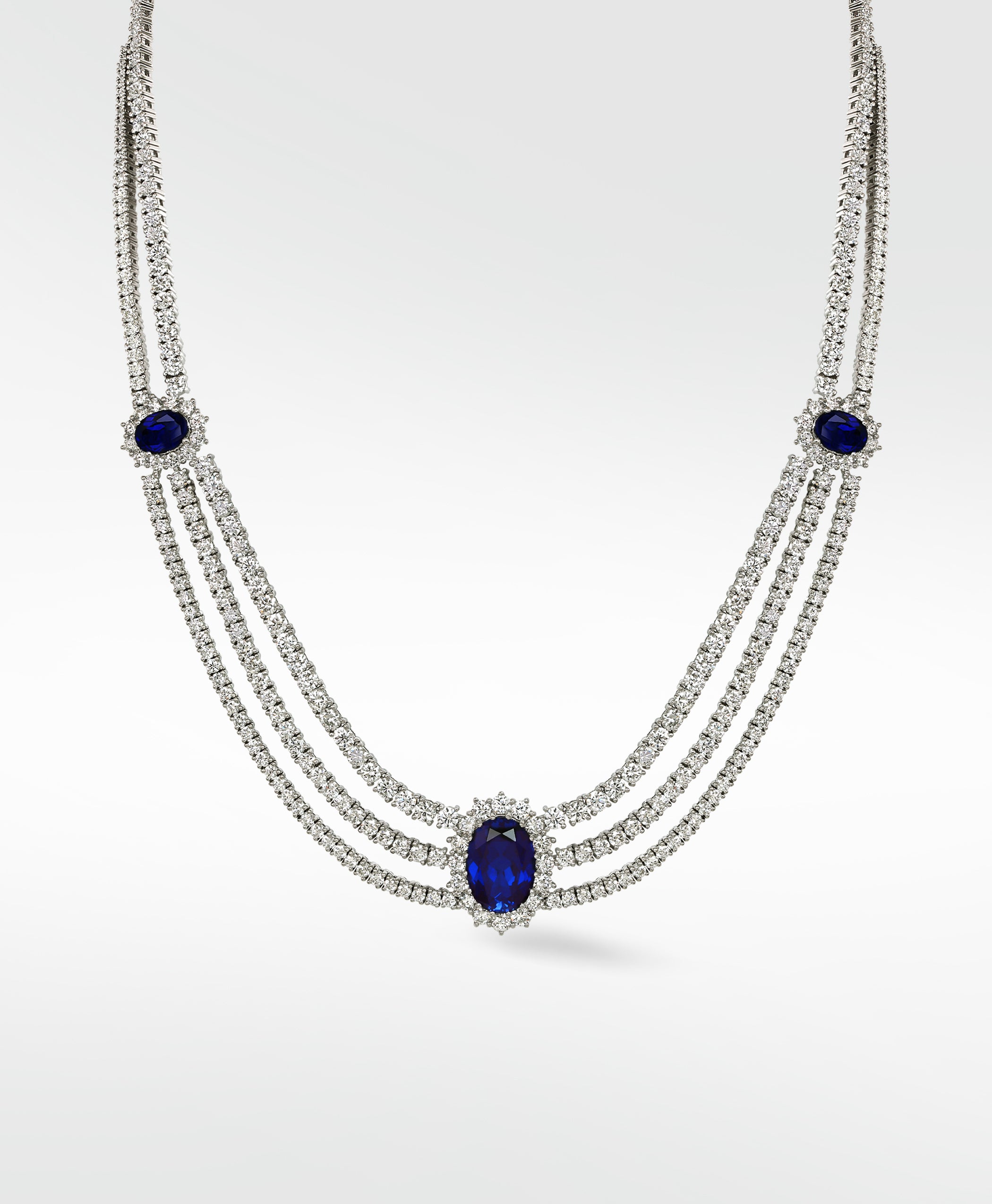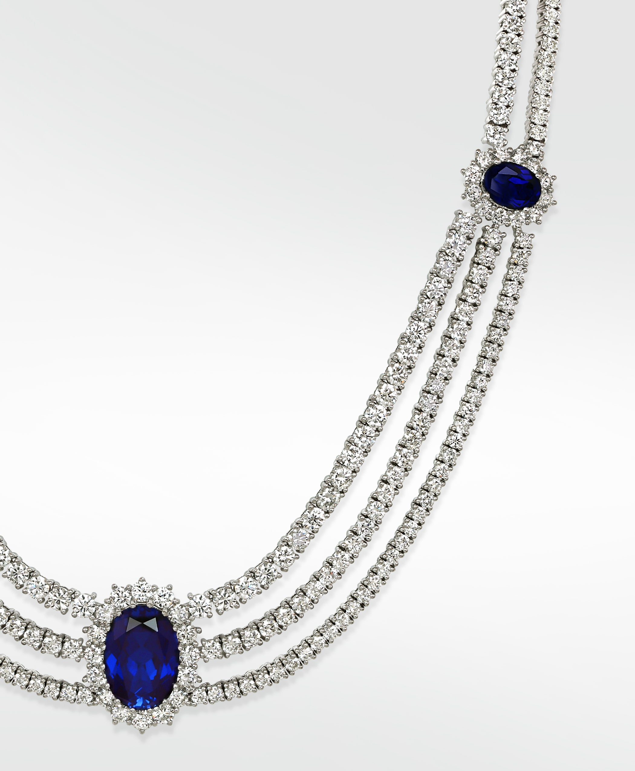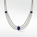 Kensington Icons - This is elegance in its most refined form. Inspired by the grandeur of Kensington’s tree-lined avenues and royal residences, this necklace radiates an understated sophistication. A lab grown deep blue sapphire centerpiece — as rich and mysterious as twilight over palace gates — is flanked by cascading rows of brilliant diamonds, each one precision-set to catch the light with grace.