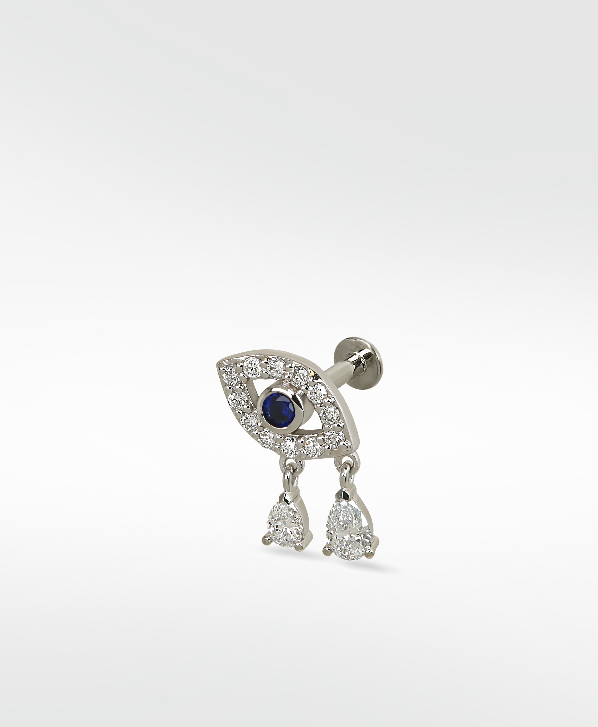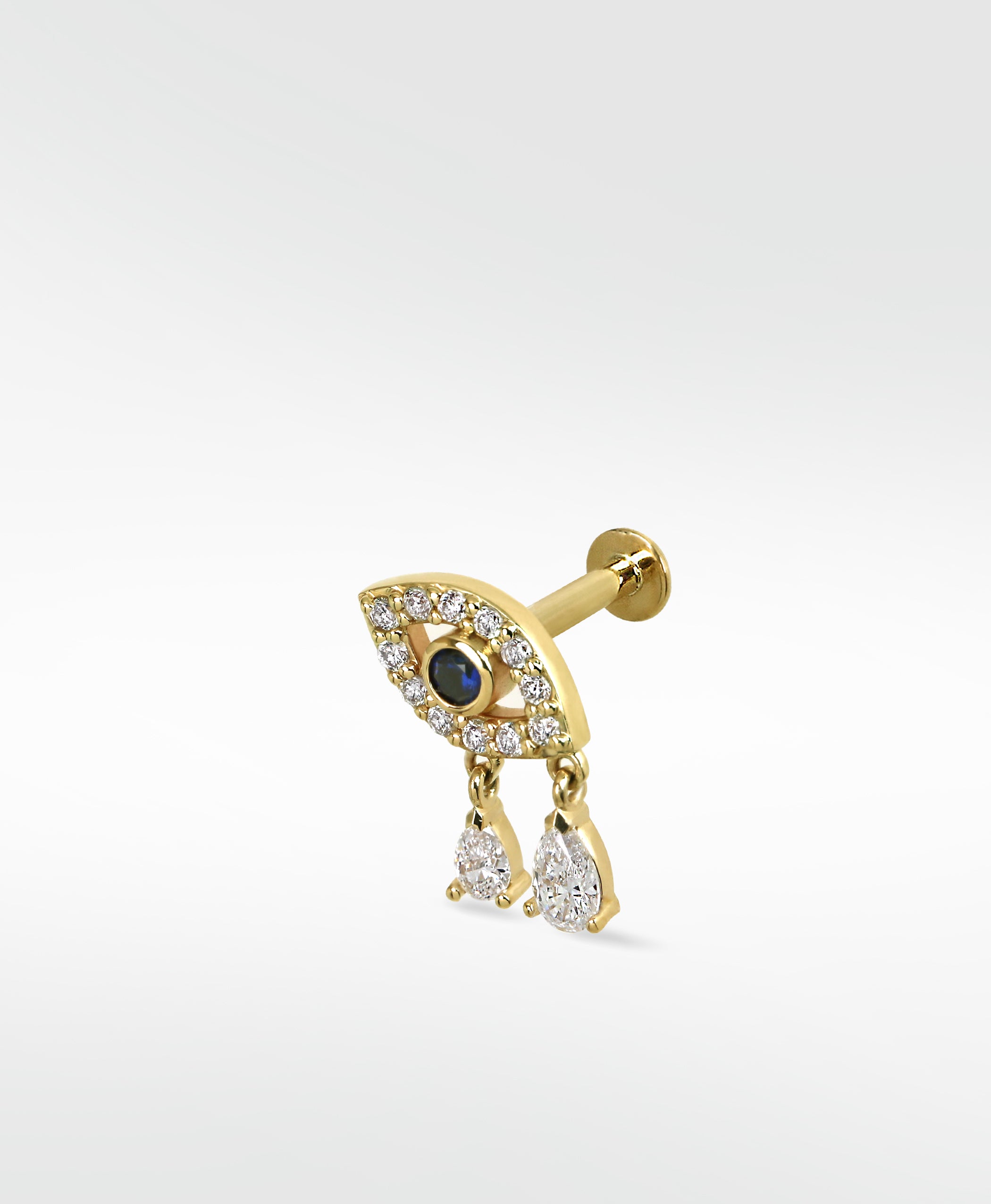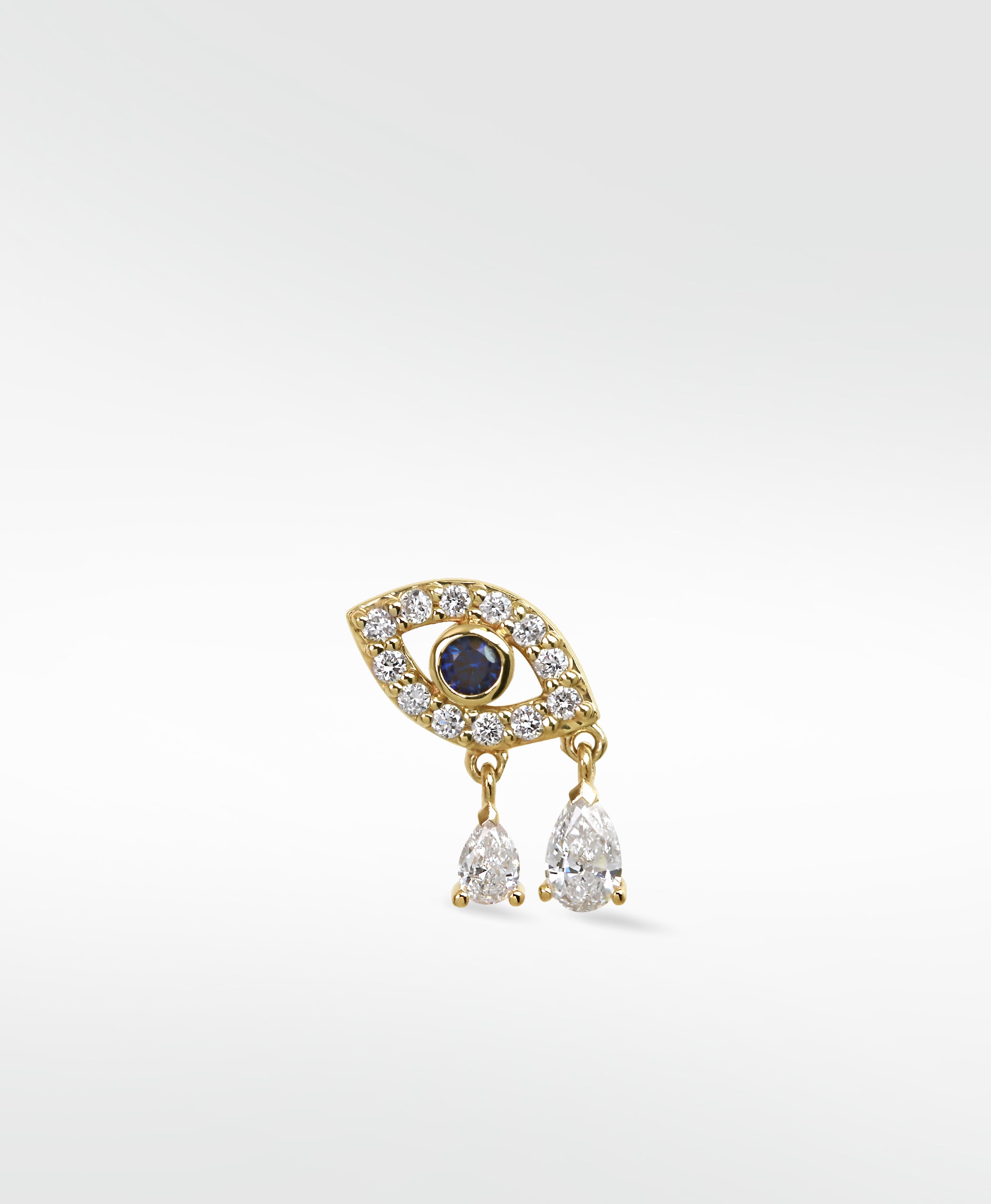 Crafted in 14k gold and set with a vivid blue sapphire at the center, this delicate stud is a modern take on the classic protective symbol. The teardrop accents add movement and elegance, making them perfect for expressing your vision and creativity while keeping your energy safeguarded. The two diamond drops give a wonderful movement to the piece- great for any location on the ear. Two tear drops for everywhere you're rising at once.