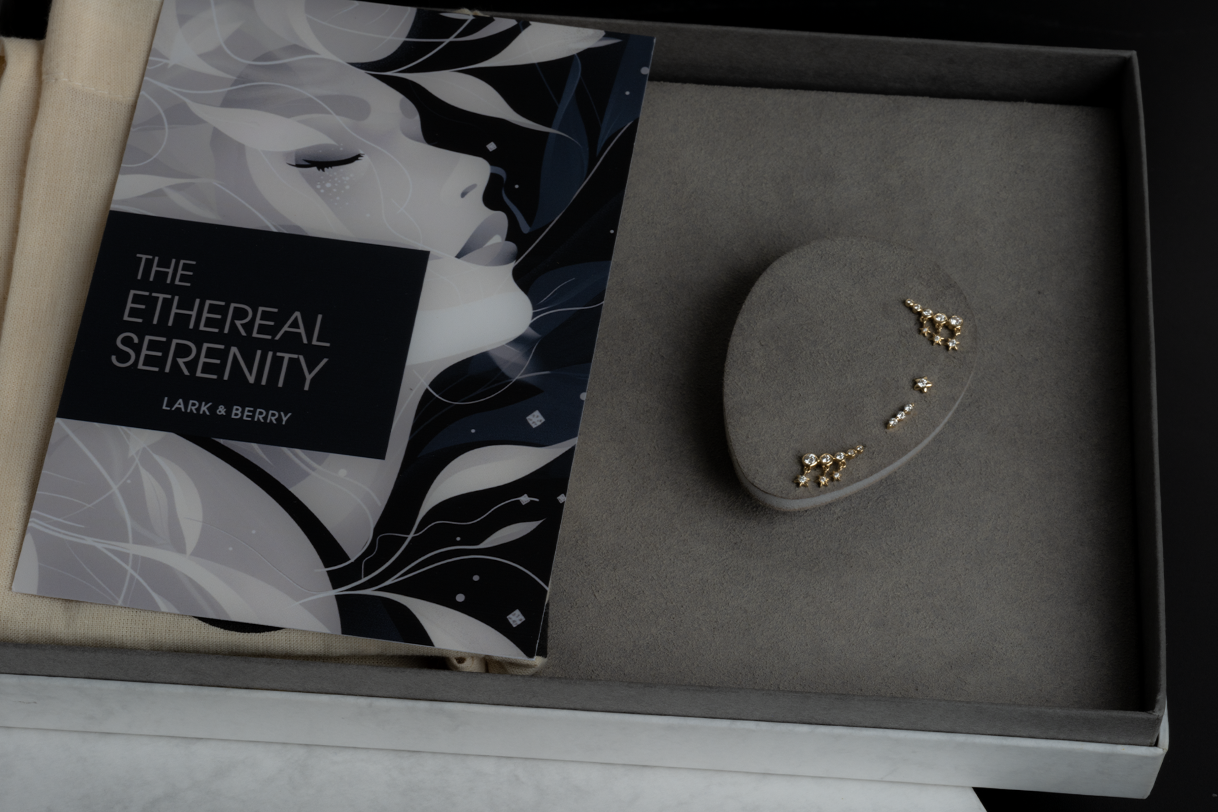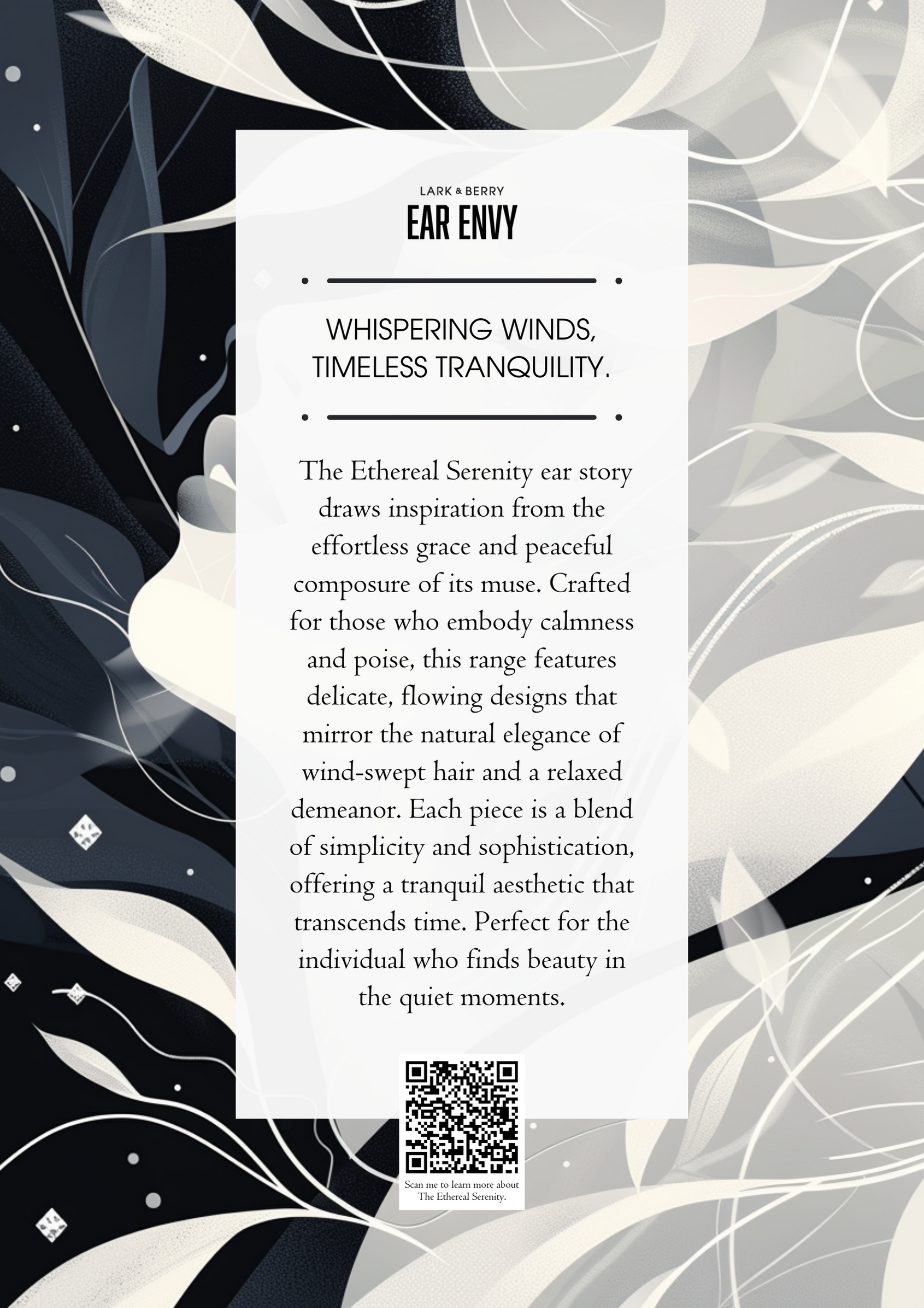 The Ethereal Serenity ear story draws inspiration from the effortless grace and peaceful composure of its muse. Crafted for those who embody calmness and poise, this range features delicate, flowing designs that mirror the natural elegance of wind-swept hair and a relaxed demeanor. Each piece is a blend of simplicity and sophistication, offering a tranquil aesthetic that transcends time. Perfect for the individual who finds beauty in the quiet moments.