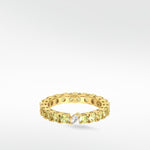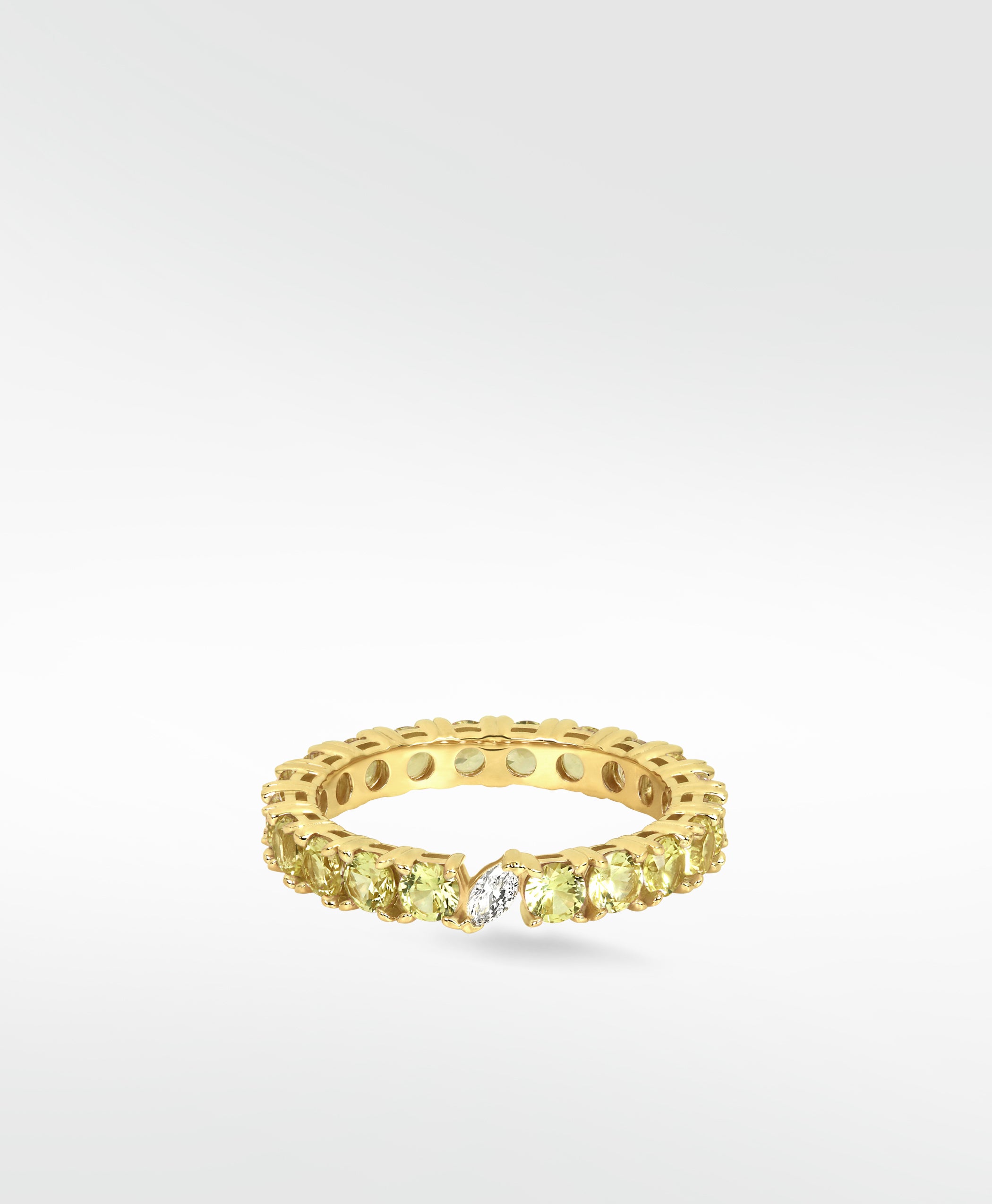 • Vibrant yellow sapphires encircle this eternity ring, highlighted by a marquise-cut diamond accent—perfectly designed for easy stacking and everyday elegance.