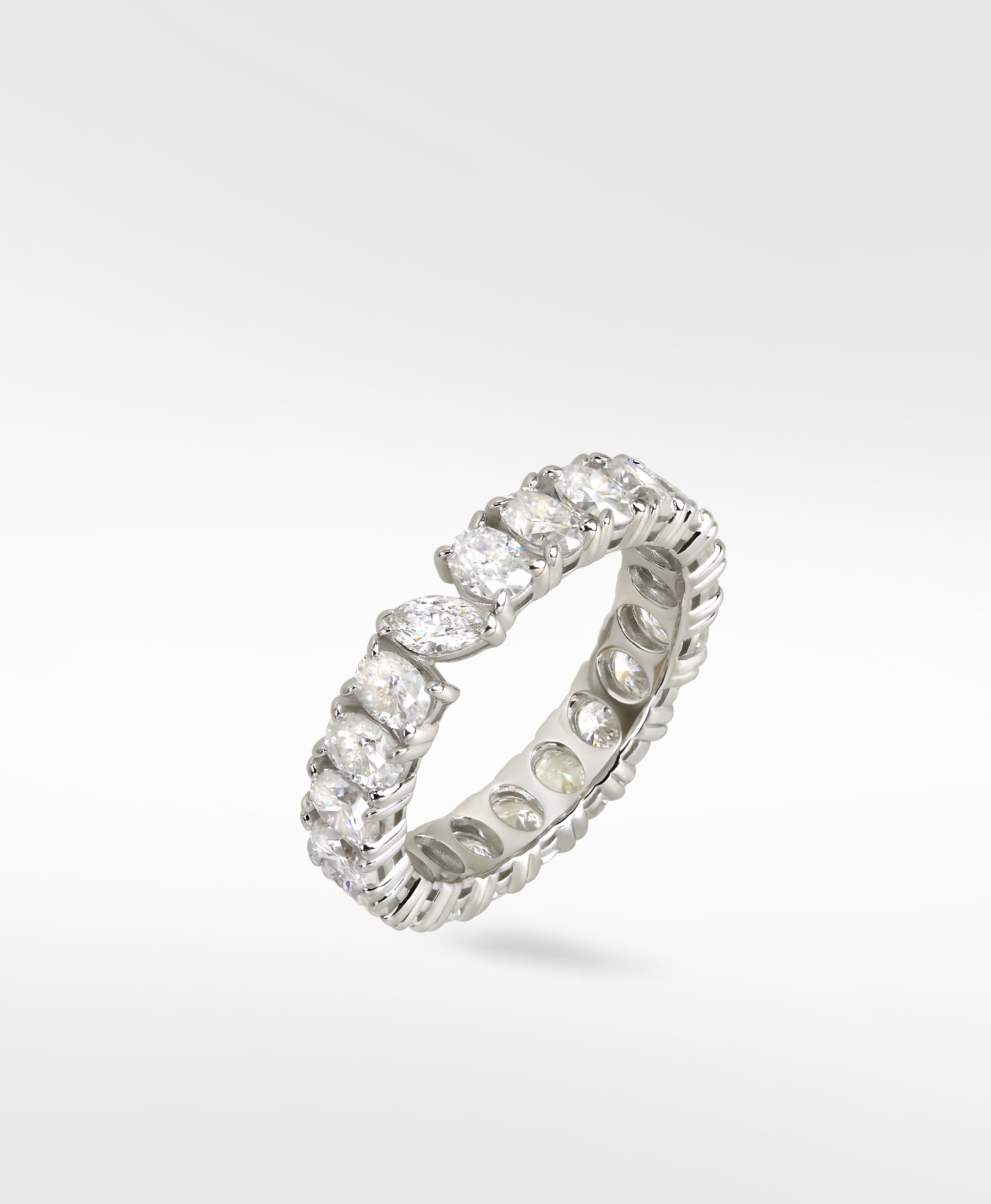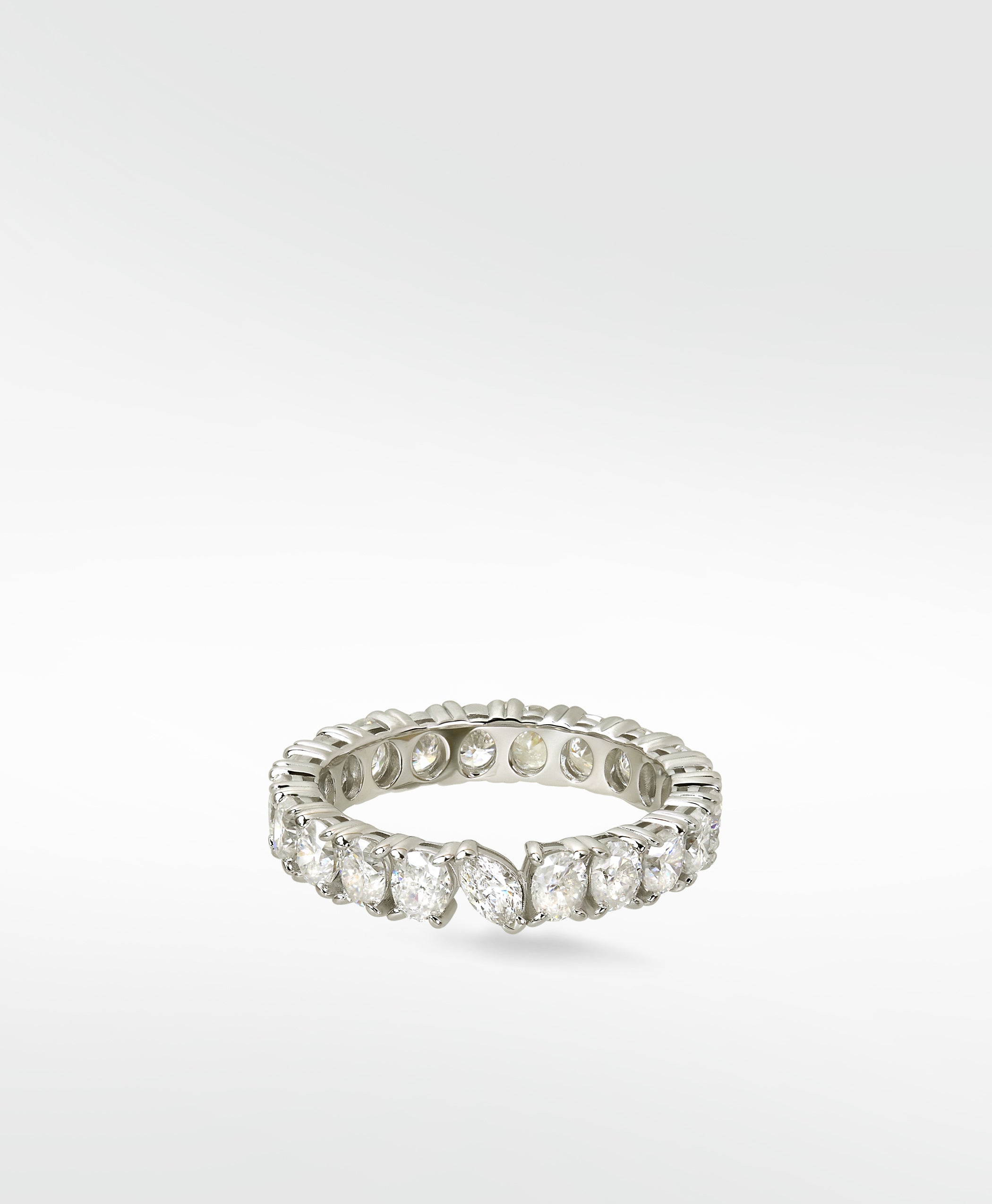 A bold evolution of the classic tennis silhouette, this striking ring redefines modern luxury with an unexpected twist. At its heart, mesmerising portrait-set oval-cut stones are enriched by a daring offset marquise accent, a testament to avant-garde elegance.