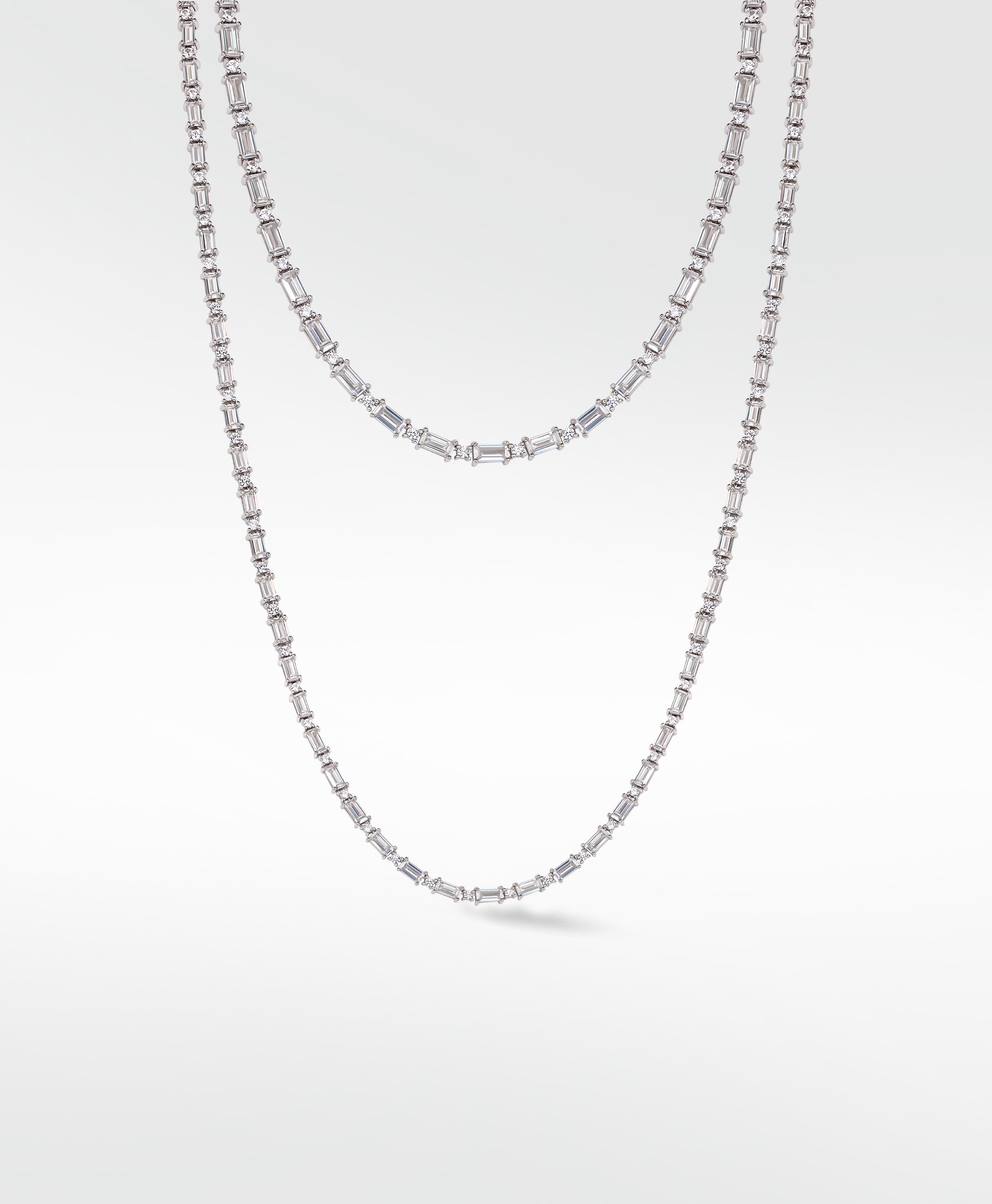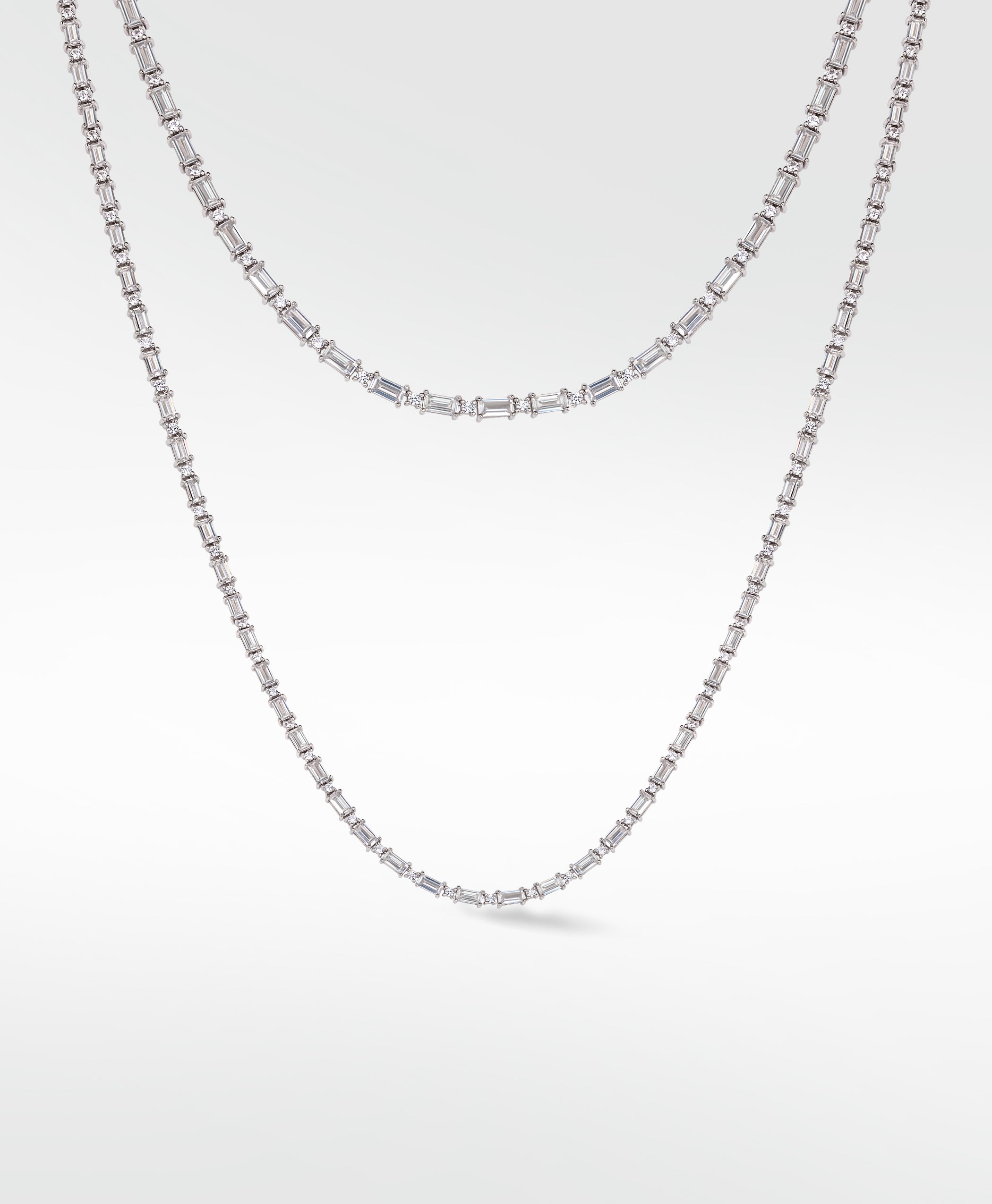 Like a double bolt of lightening, this necklace of baguette cut sapphire stones is sure to stun and draw the eyes of everyone around.